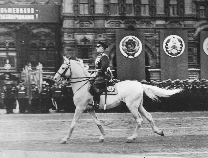 А 24 июня в Москве четырежды Герой Советского Союза, кавалер двух орденов «Победа» и множества других советских и иностранных наград на белом коне выехал из кремлевских Спасских врат, чтобы принять исторический Парад Победы.