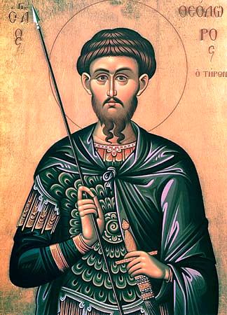 Святой мученик Феодор Тирон был воином в городе Аласии Понтийской области (северо-восточная область Малой Азии, тянувшаяся вдоль берега Понта Эвксинского, т. е. Черного моря), под начальством некоего Вринка. Его принуждали принести жертву идолам. Святой Феодор твердо, во всеуслышание исповедал свою веру во Христа Спасителя. Начальник дал ему несколько дней на размышление, во время которых святой Феодор усиленно молился. Его обвинили в поджоге языческого храма и бросили в темницу на голодную смерть. Там ему явился Господь Иисус Христос, утешил и подкрепил его. Приведенный вновь к правителю, святой Феодор еще раз смело и безбоязненно исповедал свою веру, за что был предан новым истязаниям и осужден на сожжение. Мученик Феодор без трепета взошел на костер и с молитвой и славословием предал свою святую душу Богу.