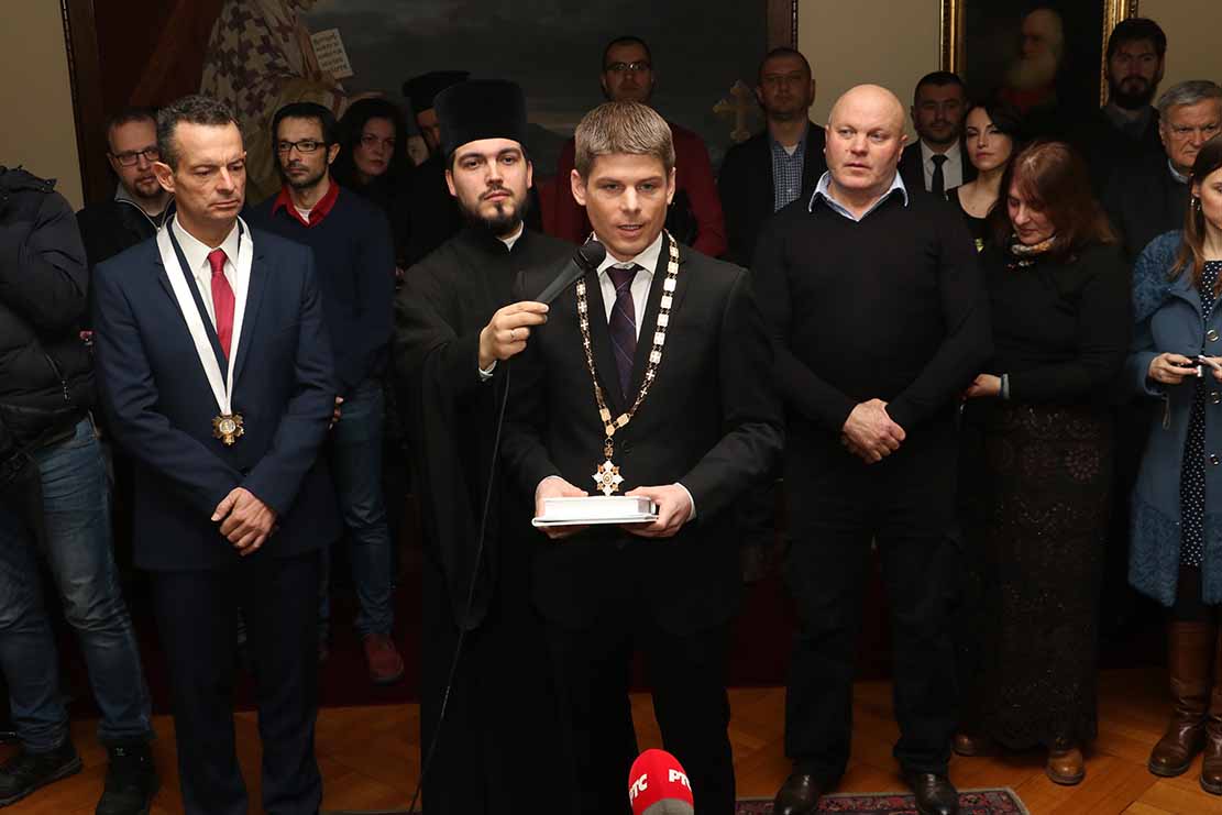 Свечаност – којој су присуствовали чланови Светог Архијерејског Синода: Епископи жички г. Јустин и зворничко-тузлански г. Фотије; као и Митрополит црногорско-приморски г. Амфилохије, Епископи рашко-призренски г. Теодосије, нишки г. Арсеније, далматински г. Никодим и моравички г. Антоније, викар Патријарх српског – отпочела је благословом и поздравним словом Његове Светости Патријарха српског г. Иринеја: -Са великом чашћу и радошћу, у име Српске Православне Цркве и српског народа, данас захваљујем двојици јунака, хероја и витезова, за све оно што су учинили за српски народ, чиме су показали своју љубав према нашeм страдалном народу и учинили велико дело које никад неће бити заборављено.