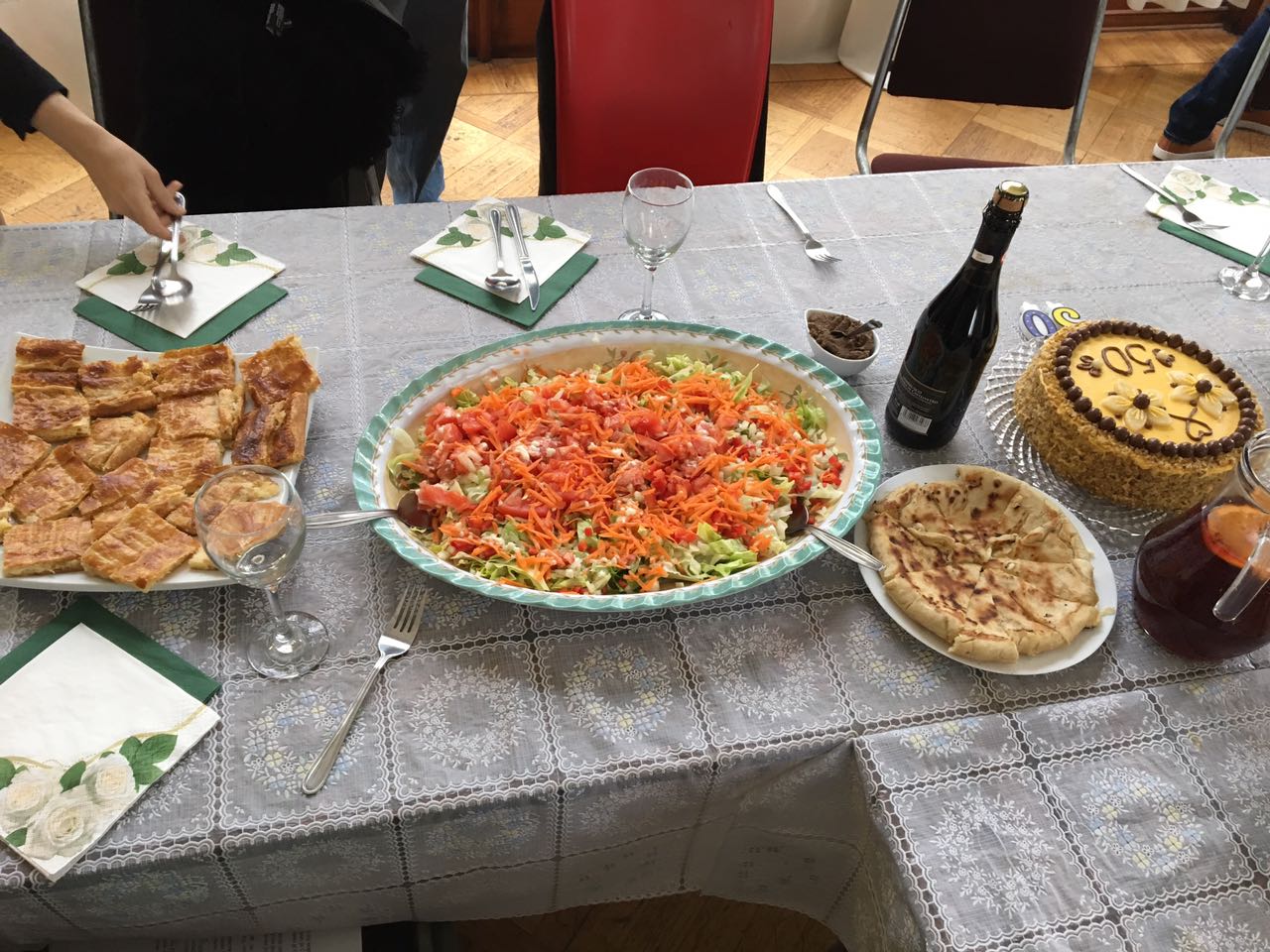 Después del primer brindis todos cantaron para el padre una canción serbia “Tamo Daleko” y sacaron las lágrimas de todos los invitados serbios. También cantaron una canción georgiana dedicada a Miro Zakaidze, quien con anterioridad había invitado a todos a disfrutar de un delicioso “Jachapuri” georgiano. El hijo del padre Dusan, Vladislav Mijailovich, también se hizo presente en la fiesta. Él hizo un pequeño concierto en el piano junto con su maestra Elena Podpyatnikova. También deleitó a los presentes Irina Kovrizhkina, quien hizo interpretación de algunas piezas musicales.