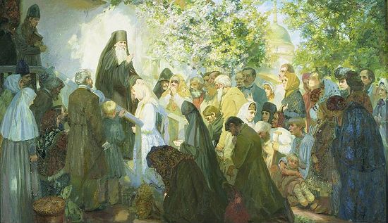 «Как на вершине горы сходятся все пути, ведущие туда, так и в Оптиной — этой духовной вершине — сошлись и высший духовный подвиг внутреннего делания, и служение миру во всей полноте, как его духовных, так и житейских нужд». К старцам в Оптину шли за утешением, исцелением, за советом… К ним шли те, кто запутался в своих житейских обстоятельствах или в философских исканиях, туда стремился тот, кто жаждал высшей правды, в этом «источнике живой воды» всякий утолял свою жажду. Выдающиеся мыслители эпохи, философы, писатели не раз и не два были там: Гоголь, Алексей и Лев Толстые, Достоевский, Владимир Соловьев, Леонтьев… — всех не перечесть. Ведь для русского человека старец — это человек, посланный Самим Богом. По словам Ф. М. Достоевского, «для души русского человека, измученной трудом и горем, а главное, всегдашней несправедливостью и всегдашним грехом, как своим, так и мировым, нет сильнее потребности и утешения, как обрести святыню или святого, пасть перед ним и поклониться ему. Если у нас грех, неправда и искушение, то все равно, есть на земле там-то, где-то святой и высший — у него, зато, правда. Значит, не умирает она на земле, а стало быть, когда-нибудь и к нам придет воцарится по всей земле, как обещано».